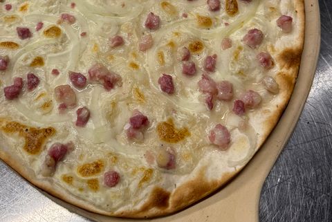 | mit Räucherlachs und ZwiebelA1,G | € 16,70 | € 8,30 | mit Speck, Zwiebel und MunsterkäseA1,G | € 16,70 | € 8,30 |